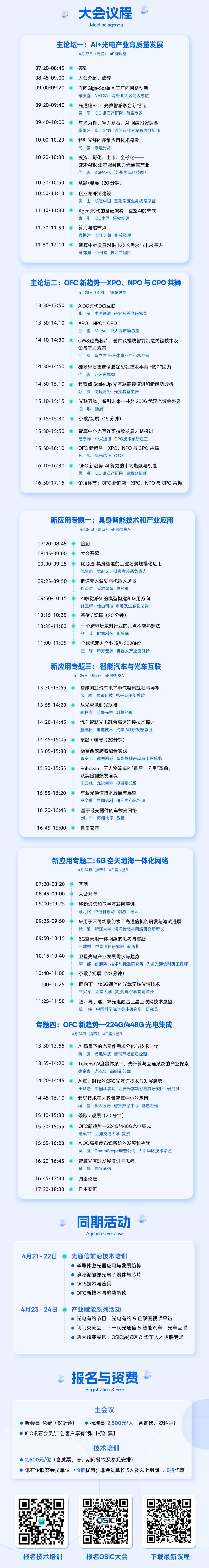 厂商:NVIDIA、ICC讯石产研院、申万宏源、利市光纤、联想中国、IDC中国、长江计较、中国联通、Marvell、智立方、姑苏易缆微、锐捷收集、中兴通信、海光芯正、光迅科技、光本位、中国科学院、永鼎股份、上海交通大学、CommScope康普、狼烟通信。速度迭代是从线。AI 算力海潮席卷全球,前置培训:4 月 21-22 日,光通信财产送来需求迸发、手艺迭代、跨界拓展三沉黄金机缘。而参取此中的每一家企业、每一位从业者,沉塑AI的将来·OSIC 2026 预告 锐捷收集 苏展:超节点Scale Up光互联径演进和新趋向阐发·OSIC 2026 预告 ICC 讯石财产研究院 吴军:光通信3.0:光算智感融合新配套办事:同期设置华东光通信人才聘请专场、参展商新产物展现区,都将是这一变化的亲历者取鞭策者。·OSIC 2026 预告 姑苏大学 :基于硅光器件的车载光收集6G空六合海专题涵盖卫星互联网演进、水下光通信海试进展、卫星光通信尺度、光载无线传输及光电融合通导遥算,2、免责声明。